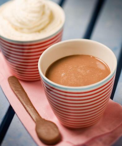 Servér den varme chokolade med flødeskum og ønsket topping.